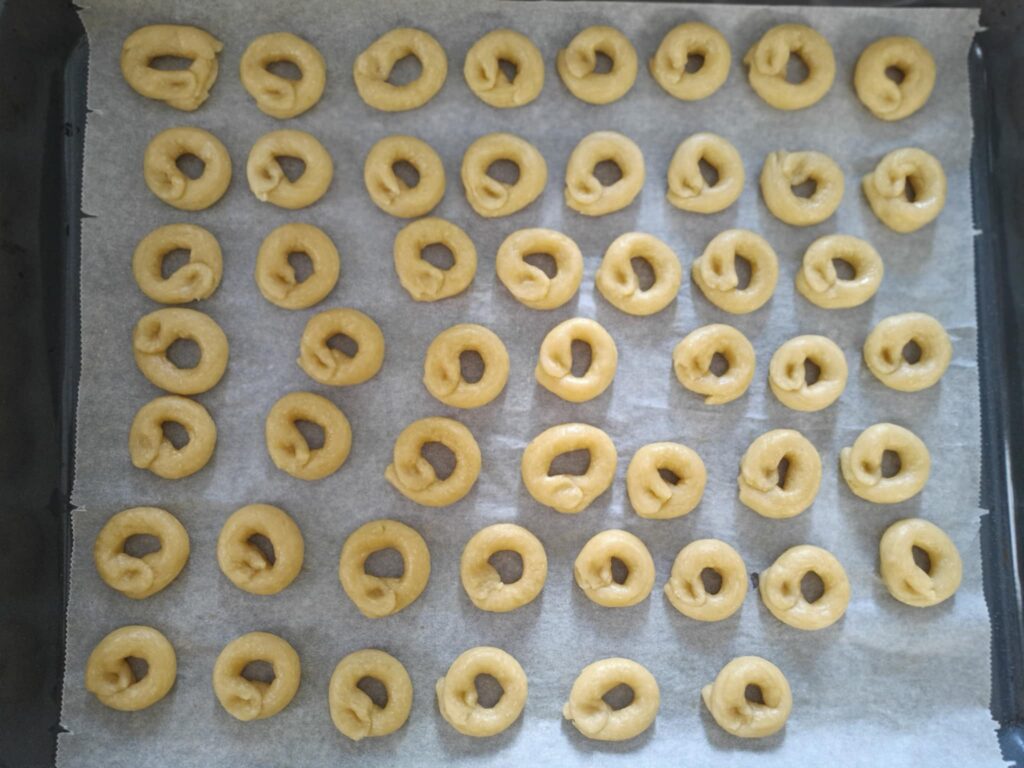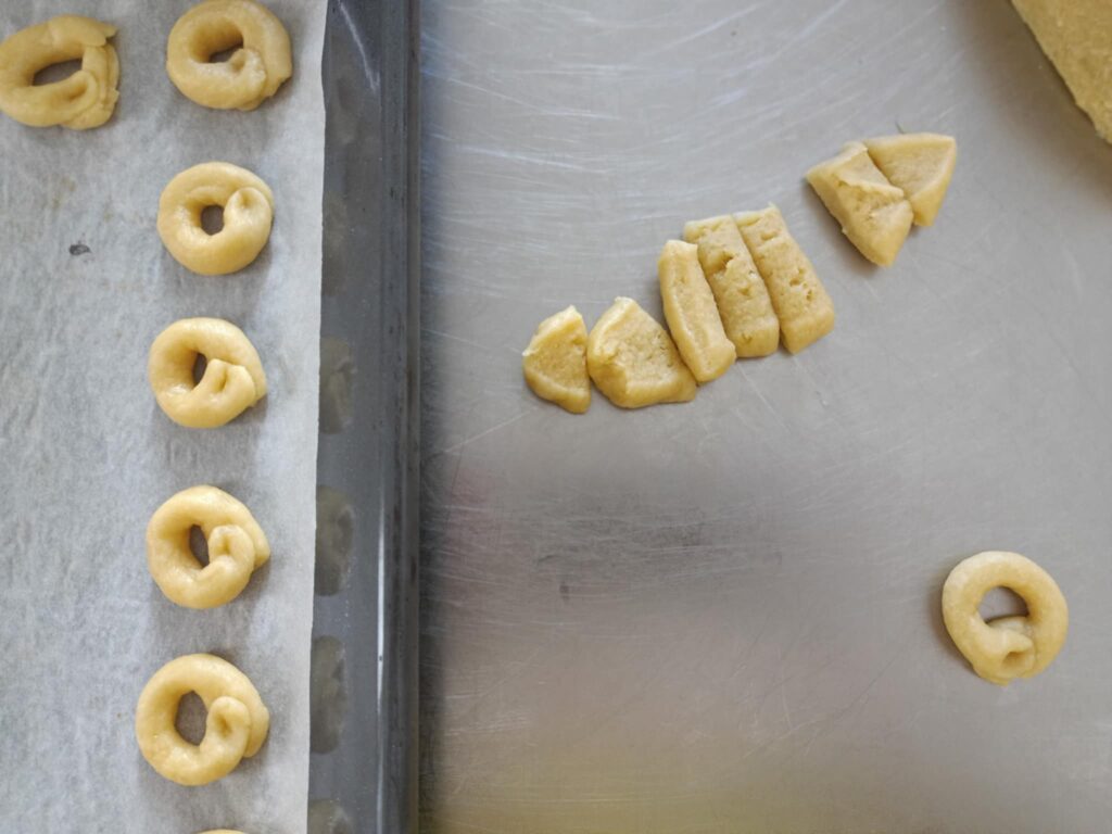 7. Sistema i tarallini su una teglia ricoperta di carta forno.