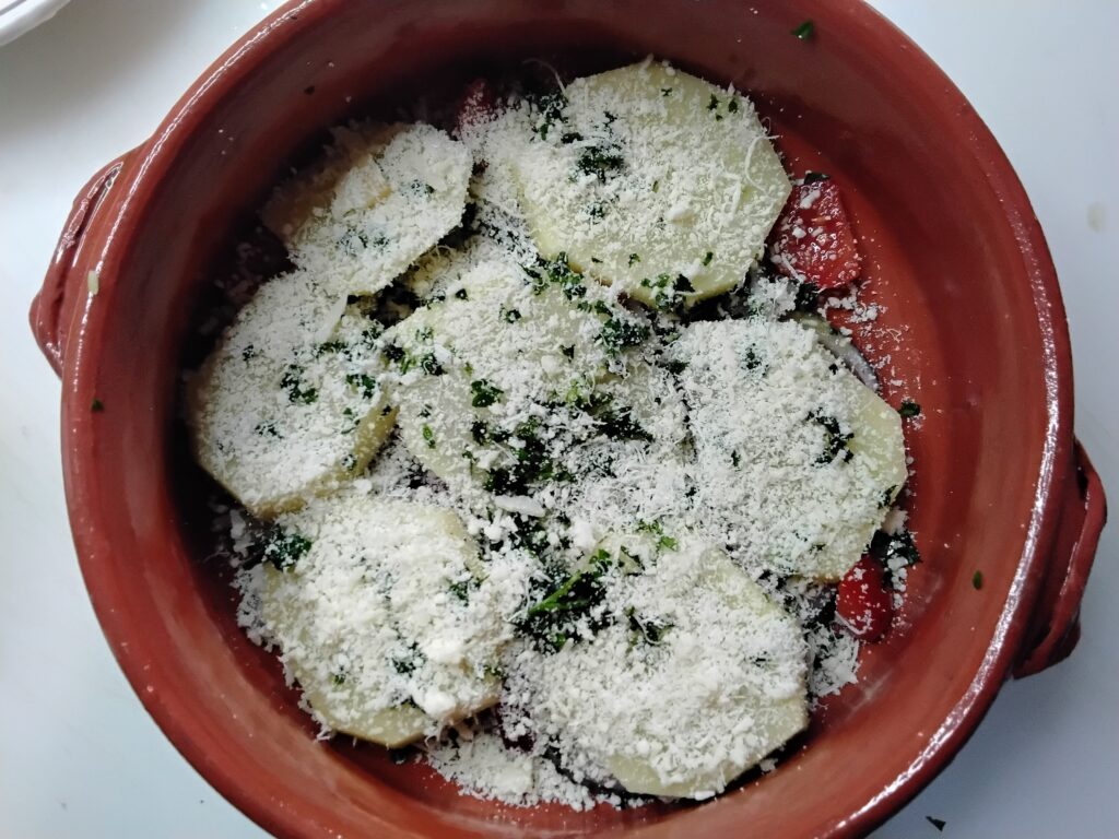 La tiella di patate, riso e polpo è una variante ricca e gustosa della tradizionale patate, riso e cozze, uno dei piatti simbolo della cucina pugliese. In questa versione, le cozze vengono sostituite dal polpo, che regala alla ricetta un sapore intenso e un profumo di mare irresistibile.