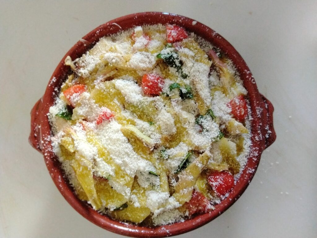 patate condite con sale, pepe , prezzemolo , 1 cucchiaio di formaggio grattugiato baccalà a tocchetti e carciofi tagliati sottilmente.