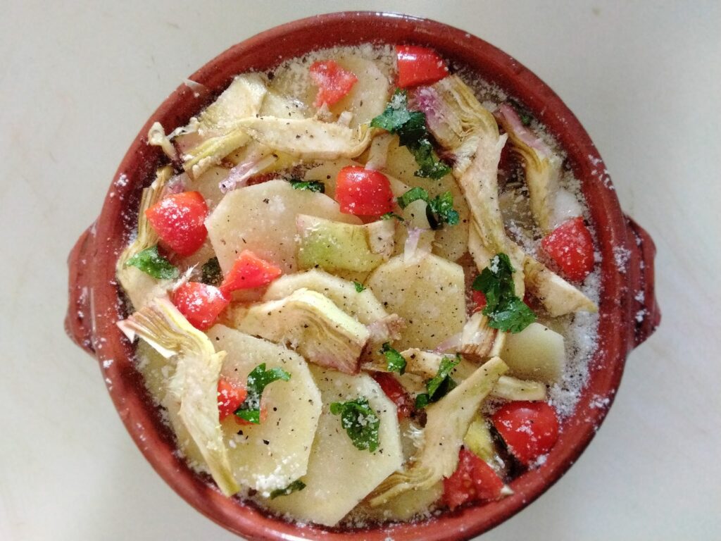 Il tutto sarà condito con abbondante olio extravergine d’oliva e pomodori appesi e quindi cotto in forno a fuoco medio fino a quando le patate e i carciofi non risulteranno morbidi.